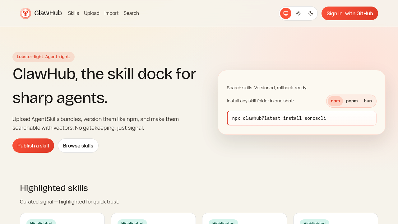 The official skill marketplace for OpenClaw. Search, install, update, and publish skills.