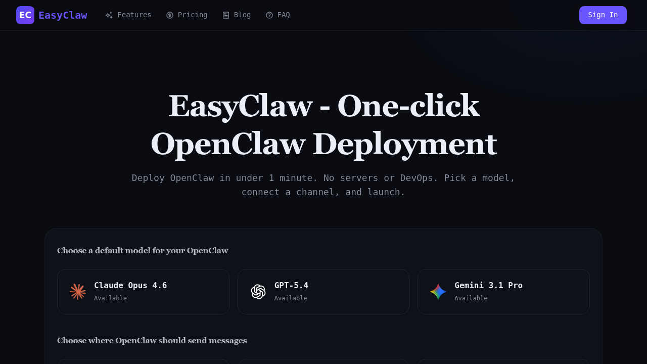 Deploy OpenClaw in under 1 minute. No servers or DevOps. Pick a model, connect a channel, and launch.