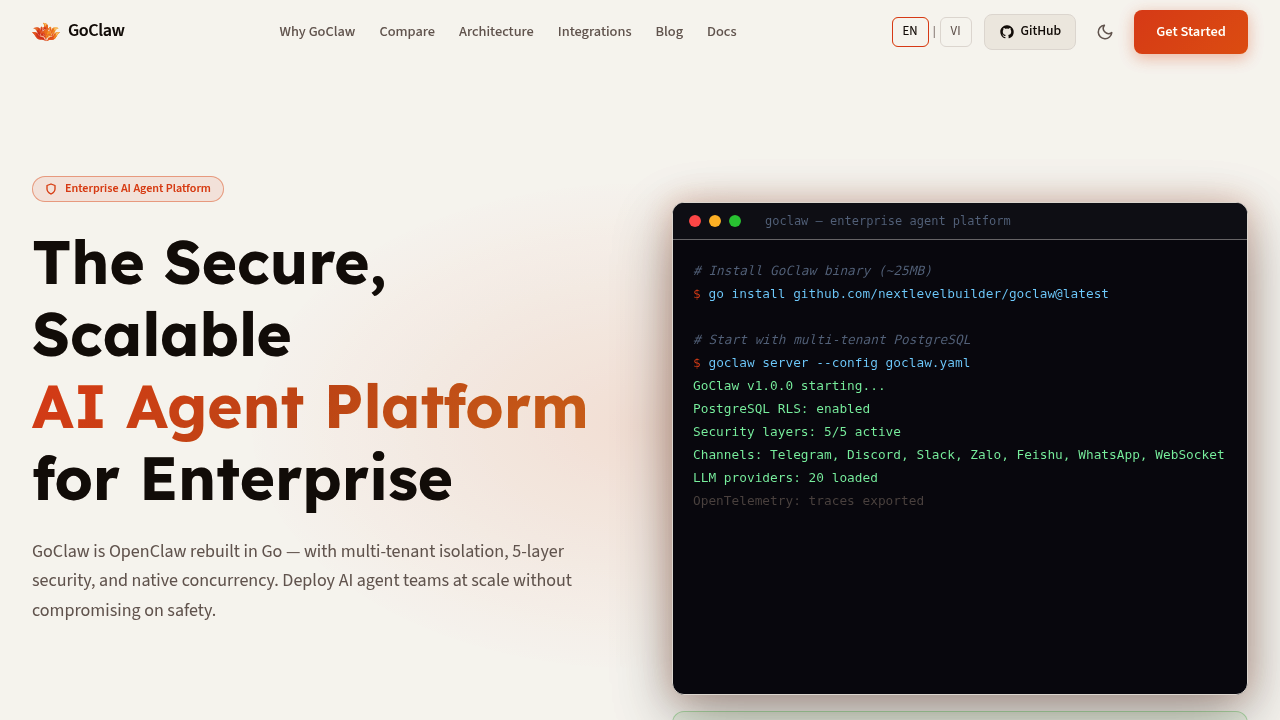 GoClaw is OpenClaw rebuilt in Go — with multi-tenant isolation, 5-layer security, and native concurrency. It allows the deployment of AI agent teams at scale without compromising on safety.