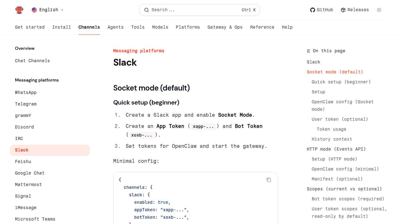 Deploy OpenClaw as a Slack bot. Workspace integration with channels, threads, and reactions.